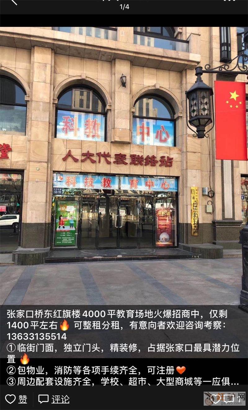 个人出租,红旗楼容辰庄园东底商,银座对面大型高档商铺,开办大型教育培训机构,现正式启动招商g+a+n+l+v+5+c+o+m。黄金地段,可整租,分租或合作办学g+a+n+l+v+5+c+o+m。临街地理位置优越,独立门头,精装修,采光好,通风好,独立上下三部直升电梯,可直接到达地下停车场,包物业,消防手续齐全,可办理教学资质,可注册赶驴网www.ganlv5.com。性价比高,门口多路公交站牌,周边多家大型高端购物街,周围有多家小学、高中及幼儿园赶~驴~网。园区生源多,内部精装修整洁安全,后勤服务保障到位,环境舒适,整体广告宣传效应对外支持赶_驴_网。致力于打造张家口高端实力的科技教育园区g.a.n.l.v.5.c.o.m。欢迎您到店考察并来电咨询g~a~n~l~v~5~c~o~m。