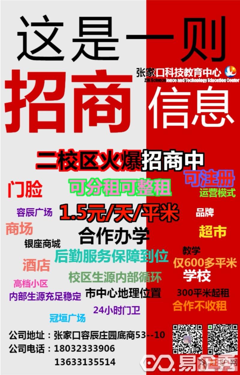三大队招商宣传语:适合办学办公二课培训可整租分租合作办学黄金地段:张家口CBD商业圈,位于红旗楼建国路6号科技教育中心(交警直属第三大队旁),容辰庄园对面,紧邻容辰小学、容辰幼儿园、卫华小学等,400...